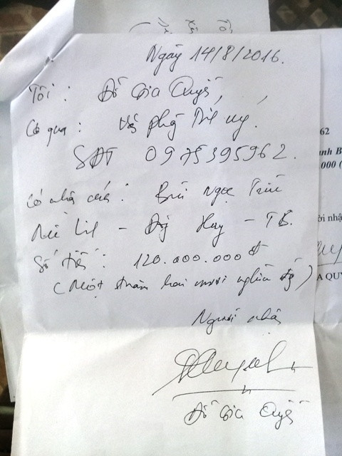 Sau một thời gian không thấy hồi âm về kết quả công việc như đã hứa, gia đình ông Trìu có hỏi thì ông Quyền viện nhiều lý do để trì hoãn. Thấy có sự bất thường, ông Trìu yêu cầu hoàn trả lại số tiền đã nhận thì ngày 3-7 vừa qua, ông Quyền viết giấy gửi gia đình với nội dung: “Xin hứa với chú Bùi Ngọc Trìu, đến ngày 15-7-2017, sẽ thanh toán toàn bộ số tiền đã nhận (270 triệu đồng)”. Tuy nhiên, đến nay, gia đình vẫn chưa nhận được số tiền phải hoàn trả, đồng thời điện thoại ông Quyền luôn trong tình trạng “ngoài vùng phủ sóng”.