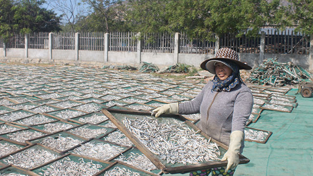 Phụ nữ Cà Ná phơi cá sau khi hấp.
