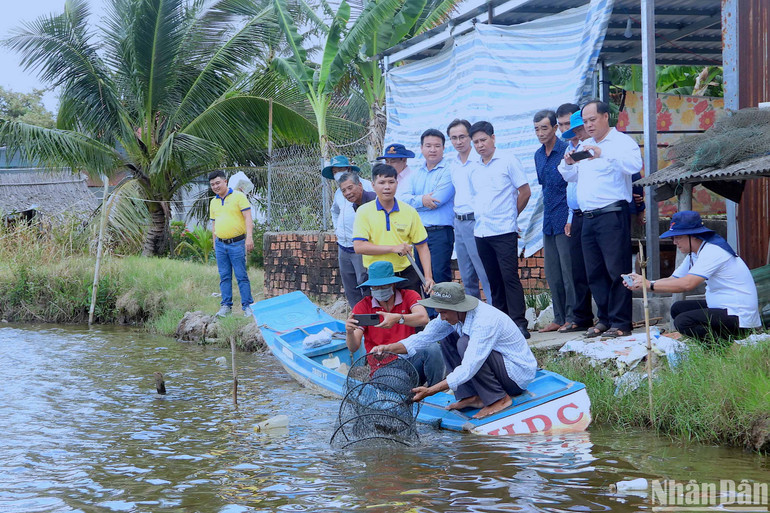 | Kiểm tra tôm đạt chuẩn BAP được nuôi tại nông hộ cộng đồng tham gia “Dự án tôm-lúa xã Biển Bạch Đông”. |