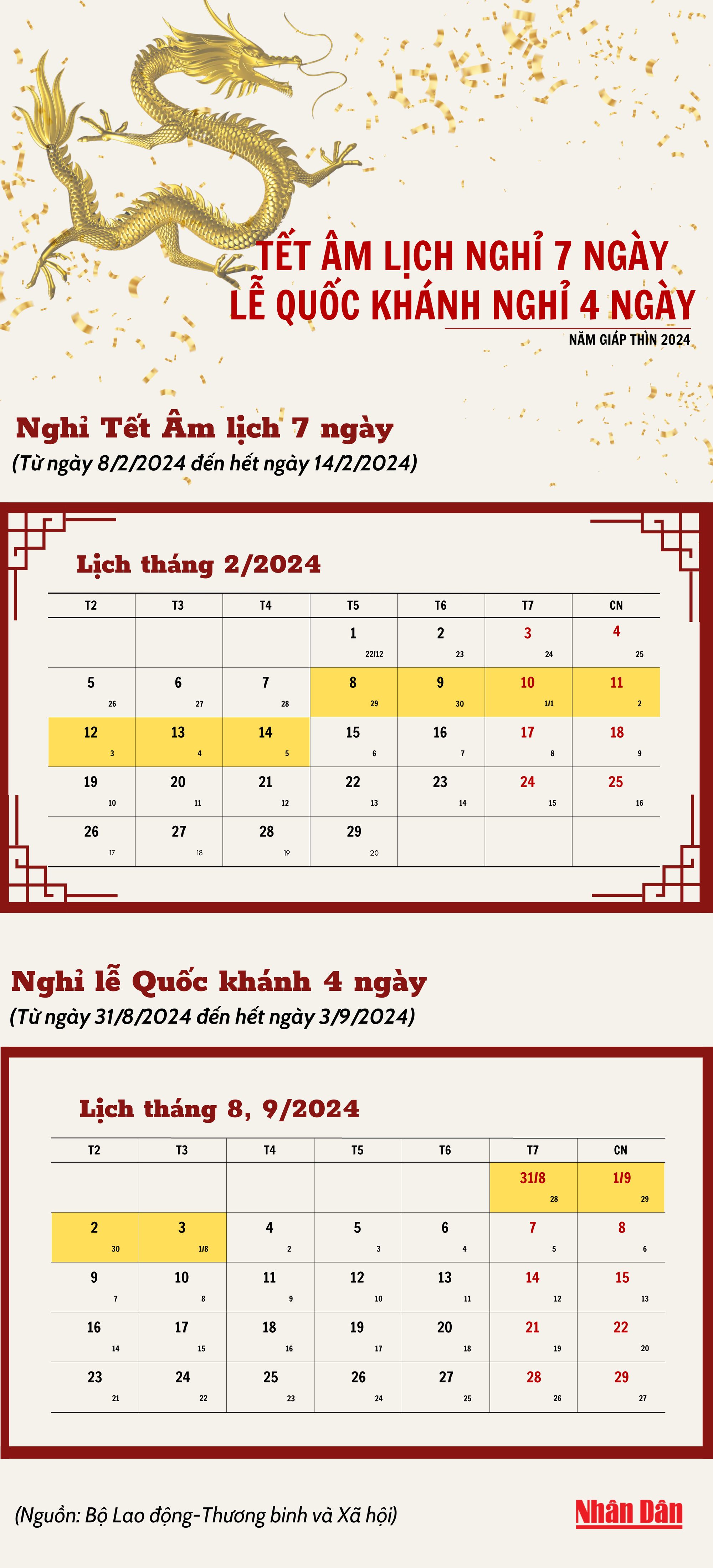 Theo văn bản số 8662/VPCP-KGVX ngày 3/11/2023 truyền đạt ý kiến của Thủ tướng Chính phủ về việc nghỉ Tết Âm lịch và lễ Quốc khánh năm 2024, Thủ tướng Chính phủ Phạm Minh Chính đồng ý với đề xuất của Bộ Lao động-Thương binh và Xã hội về việc nghỉ Tết Âm lịch 7 ngày (từ ngày 8/2/2024 đến hết ngày 14/2/2024) và nghỉ lễ Quốc khánh 4 ngày (từ ngày 31/8/2024 đến hết ngày 3/9/2024).