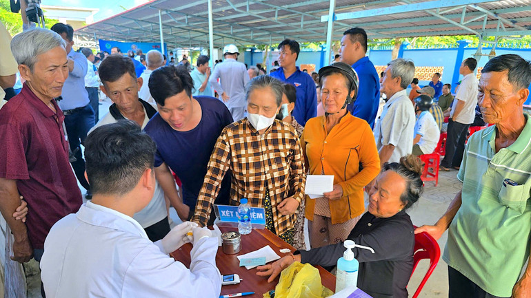 Hoạt động khám bệnh, cấp thuốc miễn phí cho người dân nhân chuyến về nguồn tại xã Tân Bằng.