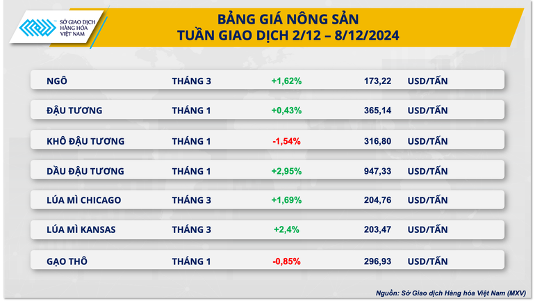 Bên cạnh đó, theo số liệu từ Hiệp hội các Nhà xuất khẩu Ngũ cốc Quốc gia (ANEC), Brazil dự kiến chỉ xuất khẩu 1,24 triệu tấn đậu tương trong tháng 12, giảm mạnh so với mức 3,79 triệu tấn cùng kỳ năm ngoái. Tổng sản lượng xuất khẩu đậu tương năm 2024 được ước tính đạt 97,1 triệu tấn, thấp hơn so với dự báo 98 triệu tấn được công bố vào đầu tháng 11. Xuất khẩu giảm từ Brazil cho thấy thị trường vẫn đang chủ yếu tập trung đối với nguồn cung từ Mỹ, thúc đẩy lực mua đối với giá.