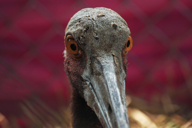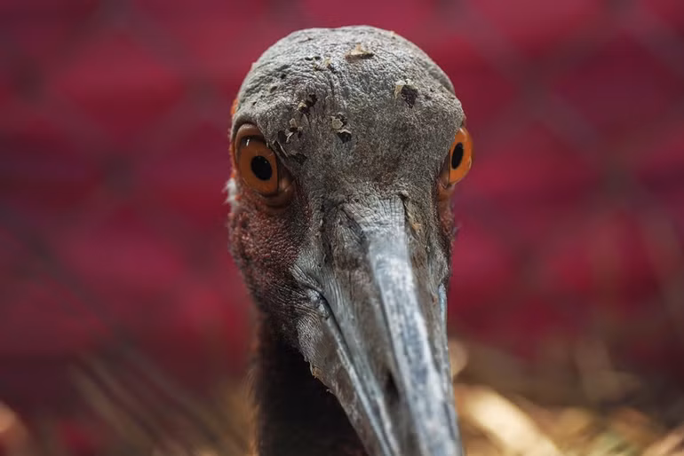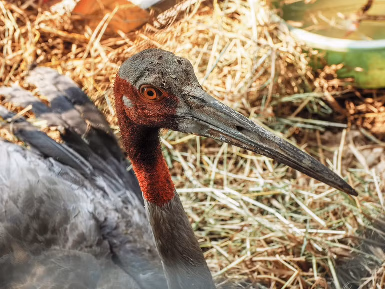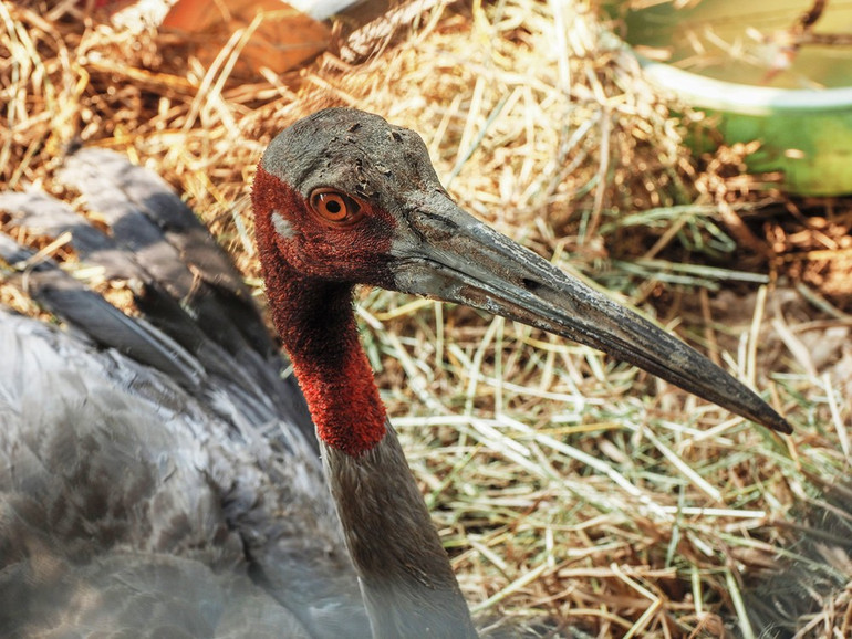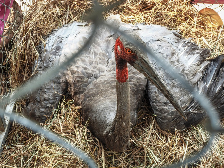 Cá thể sếu đầu đỏ đực những ngày được chăm sóc ở Trung tâm Bảo tồn và phát triển sinh vật Vườn quốc gia Tràm Chim.