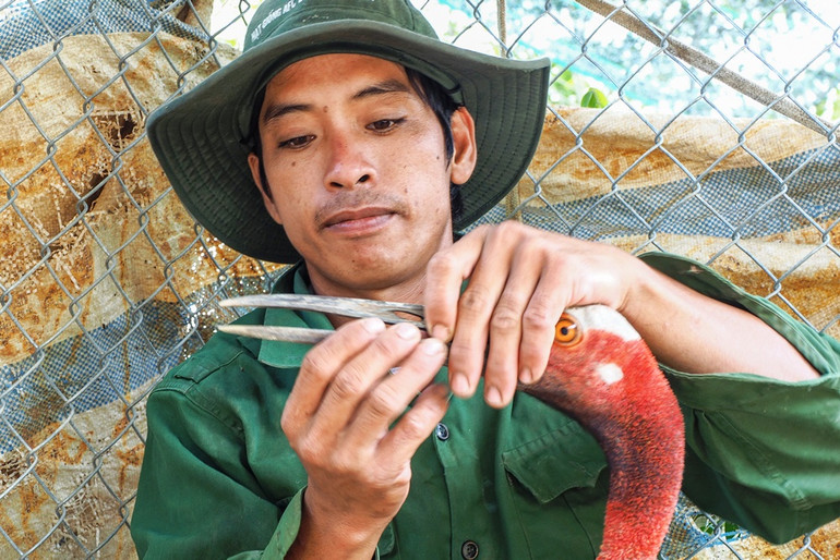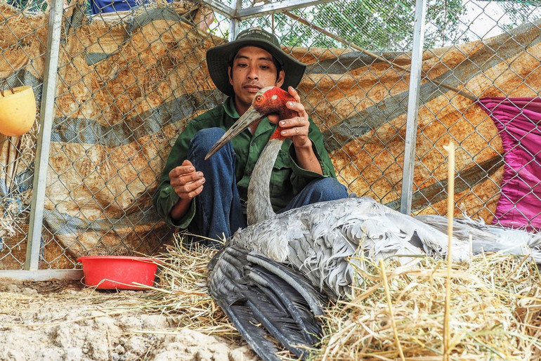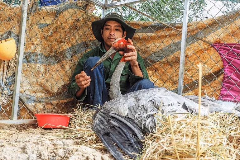 Nhân viên Trung tâm chăm sóc cá thể sếu đầu đỏ.