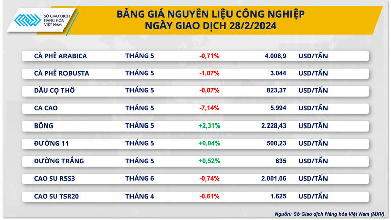 Theo MXV, khép lại phiên giao dịch 28/2, sắc đỏ chiếm ưu thế trên bảng giá nguyên liệu công nghiệp. Trong đó, giá hai mặt hàng cà-phê quay đầu suy yếu khi đánh mất 0,71% với Arabica và 1,07% với Robusta. Những tín hiệu tích cực về tồn kho kết hợp với tỷ giá USD/BRL tăng là yếu tố đã gây sức ép lên giá cà-phê trong phiên hôm qua.