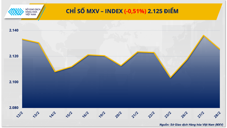 Số liệu từ Sở Giao dịch Hàng hóa Việt Nam (MXV) cho thấy, kết thúc ngày giao dịch hôm qua (28/2), 21 trên tổng số 31 mặt hàng đang được giao dịch liên thông thế giới tại MXV đồng loạt giảm giá.