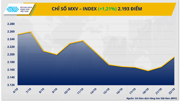 Theo Sở Giao dịch Hàng hóa Việt Nam (MXV), thị trường hàng hóa nguyên liệu thế giới đón nhận lực mua tích cực trong phiên giao dịch ngày hôm qua (22/10). Đóng cửa, chỉ số MXV-Index tăng 1,21% lên 2.193 điểm. Đáng chú ý, sắc xanh chiếm áp đảo trên thị trường kim loại, trong đó, giá bạc lên mức cao nhất trong 12 năm nhờ nhu cầu trú ẩn an toàn gia tăng. Trong khi đó, thị trường nguyên liệu công nghiệp đi ngược chiều với xu hướng chung của toàn thị trường khi nhiều mặt hàng đồng loạt giảm giá.