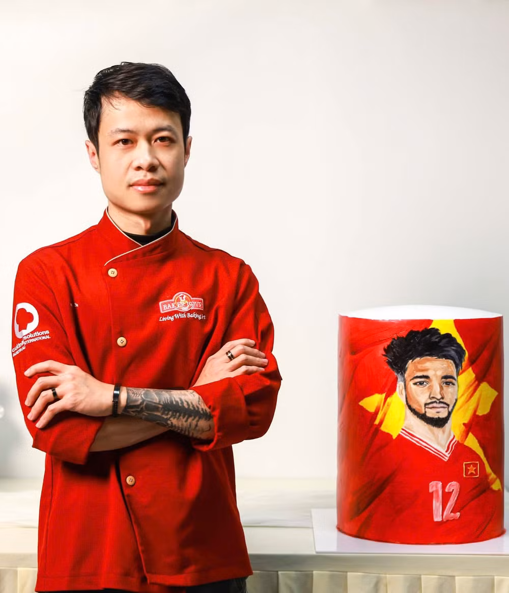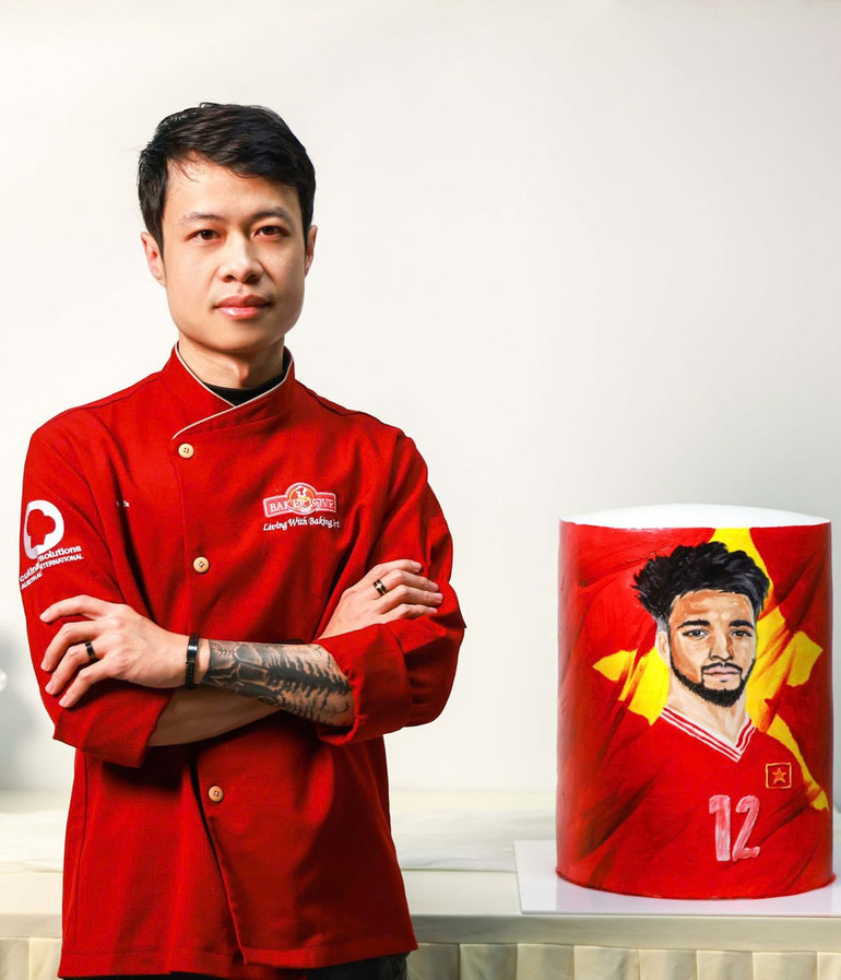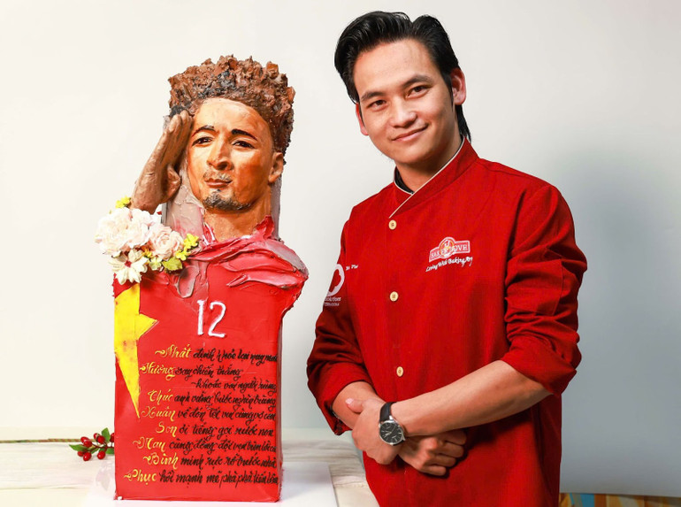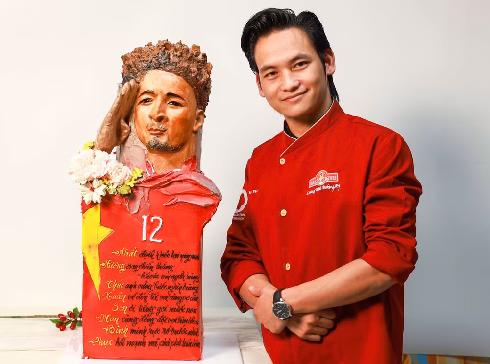 Bên cạnh tác phẩm thơ trên bánh điêu khắc 3D của Tình Phan, nghệ nhân Bàn Văn Quỳnh đã sử dụng silverwhip để tạo ra một chiếc bánh kem trang trí hình cầu thủ mang số áo 12 - số áo của Nguyễn Xuân Son.