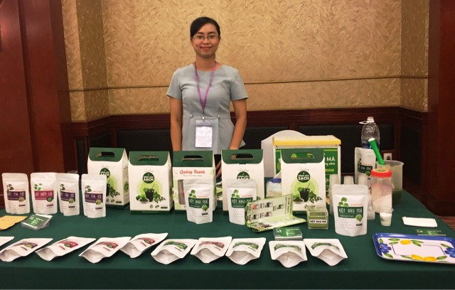 Gian hàng trưng bày sản phẩm của starup trẻ với rau má Quảng Thanh – sản phẩm sạch, an toàn.