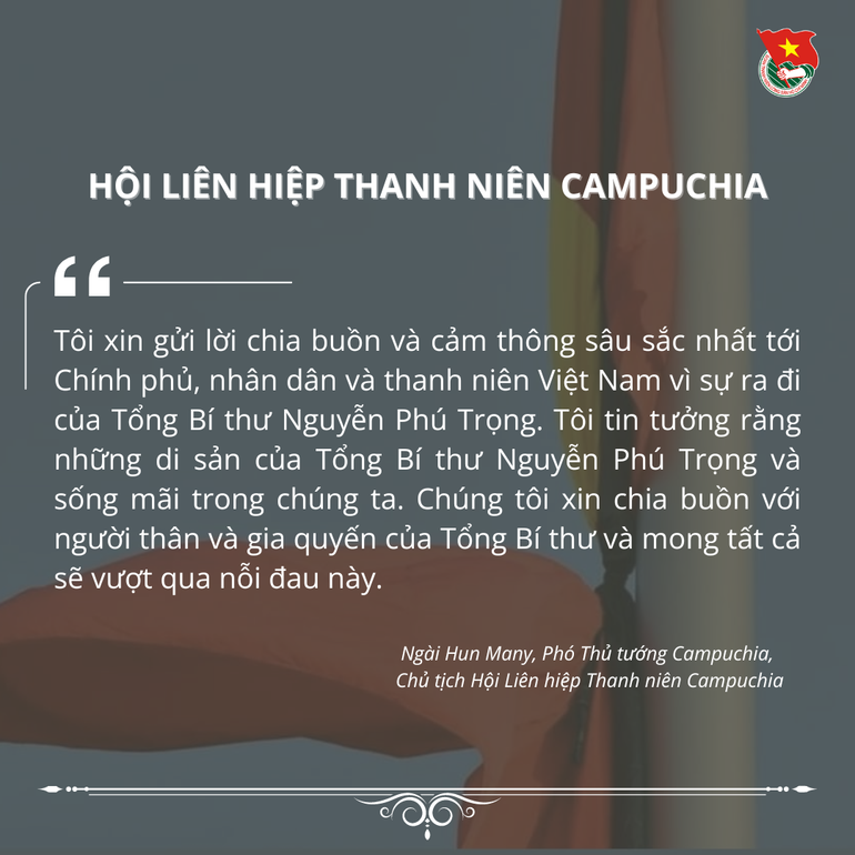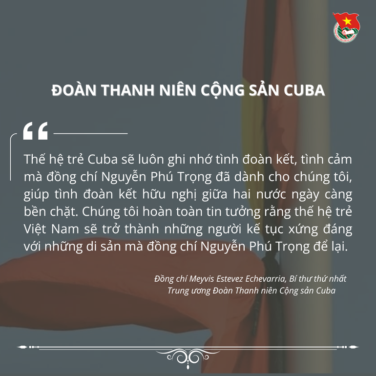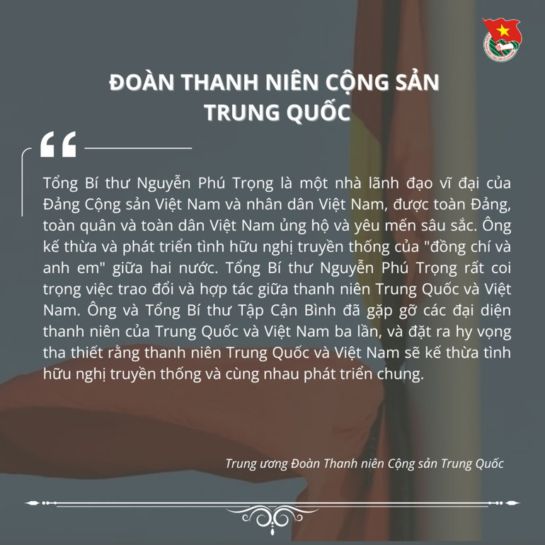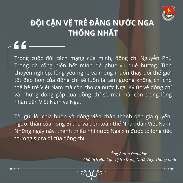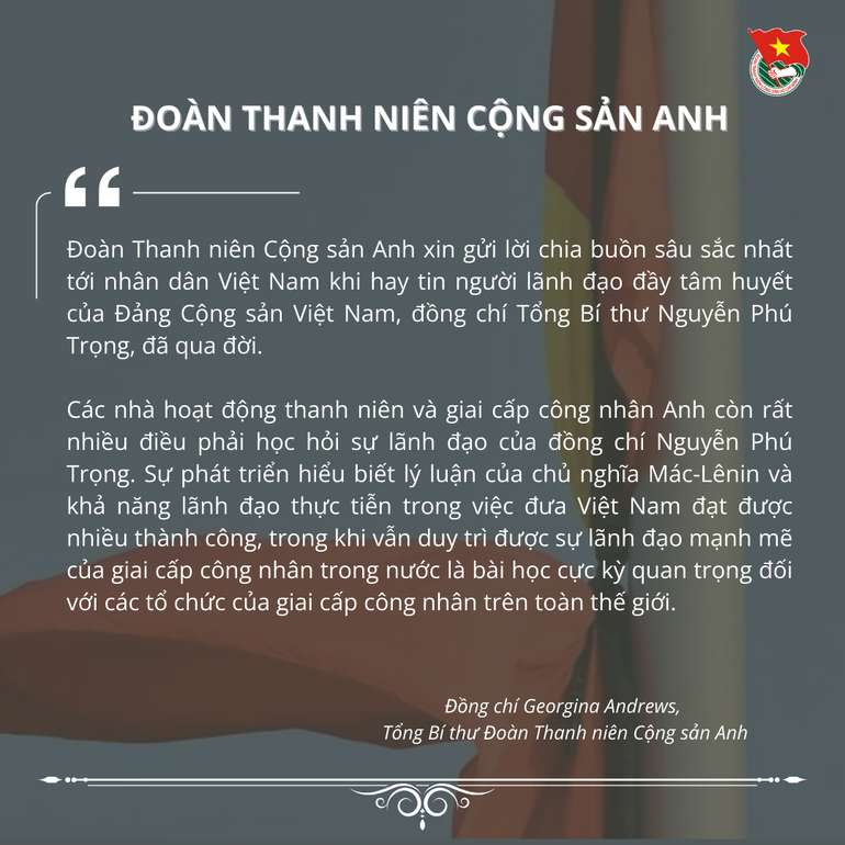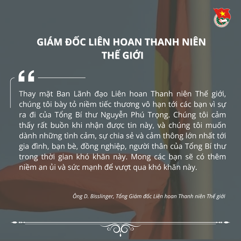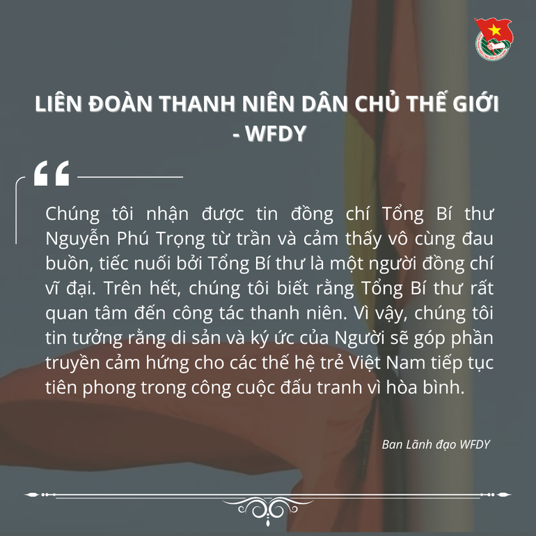 Được tin đồng chí Nguyễn Phú Trọng, Tổng Bí thư Ban Chấp hành Trung ương Đảng Cộng sản Việt Nam từ trần, lãnh đạo các tổ chức thanh niên trên thế giới đã gửi các điện, thư, thông điệp chia buồn với Đảng, Chính phủ, nhân dân và thanh thiếu nhi nước ta.