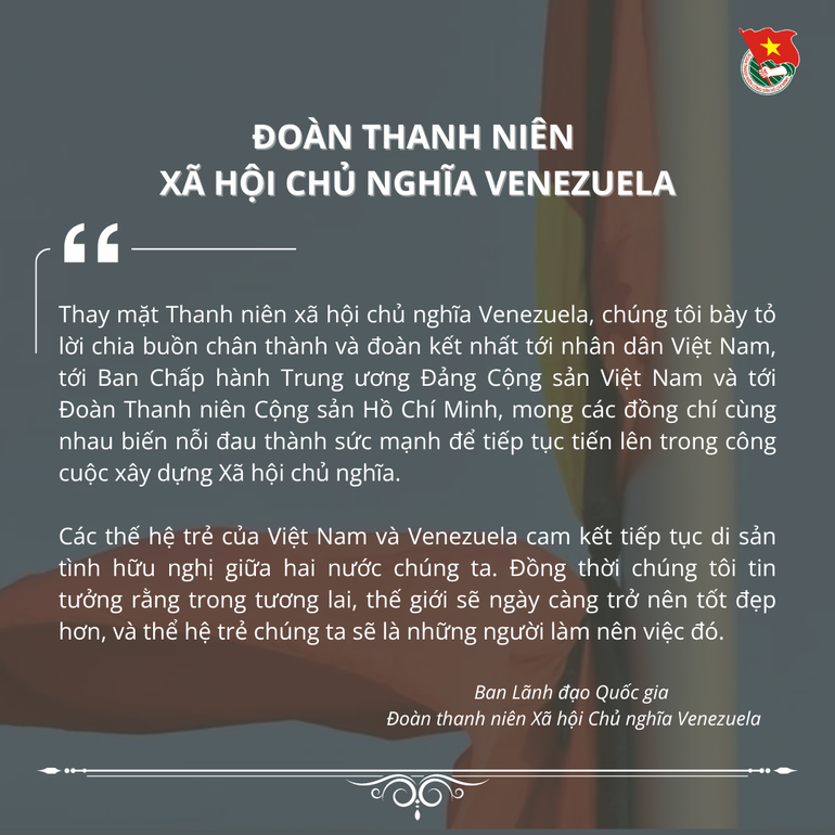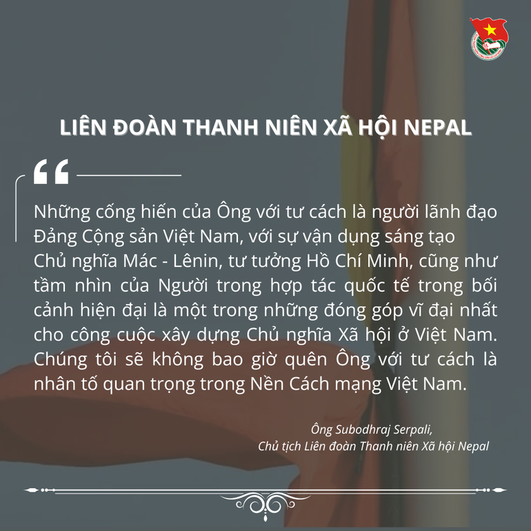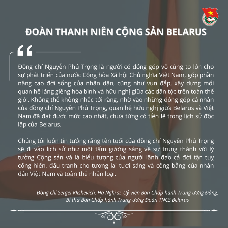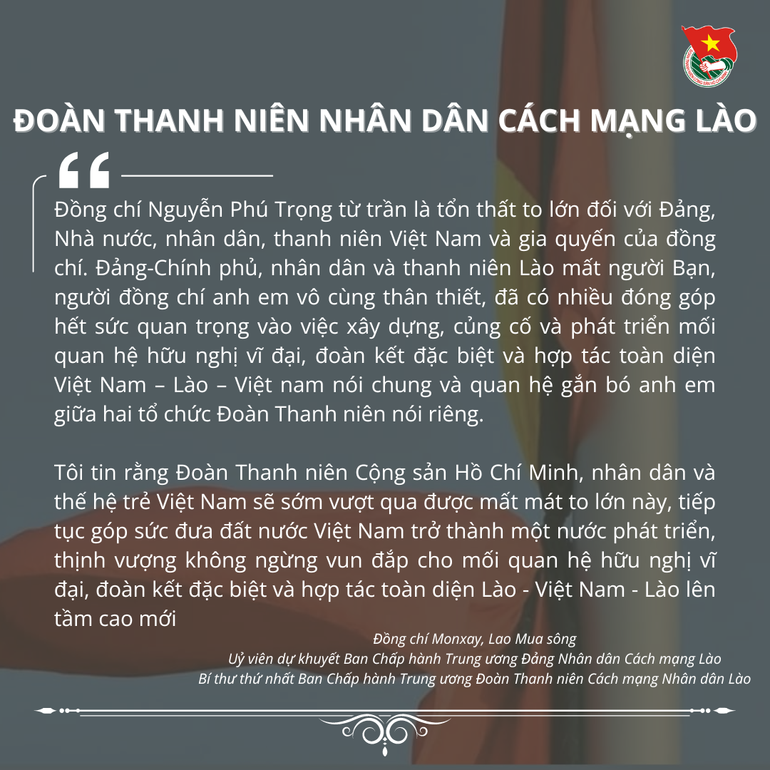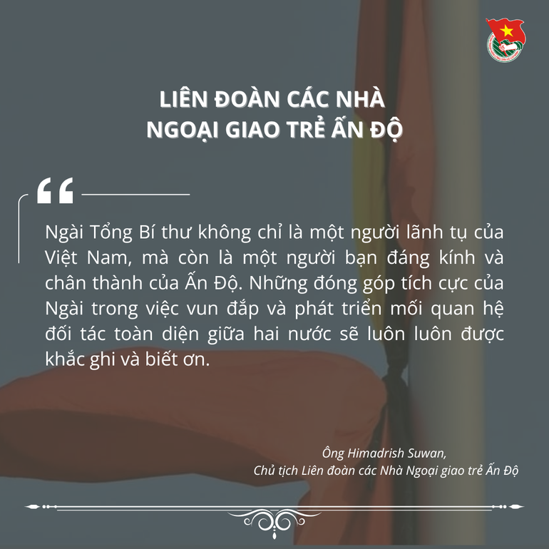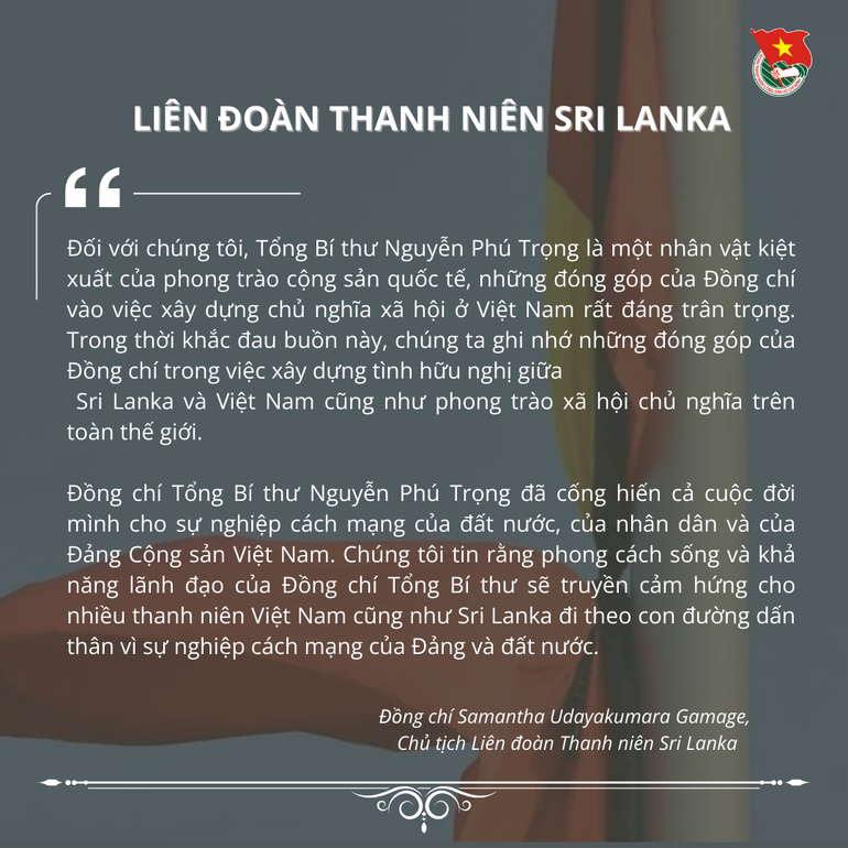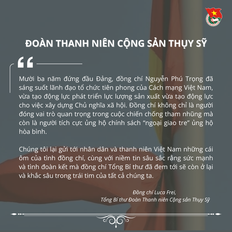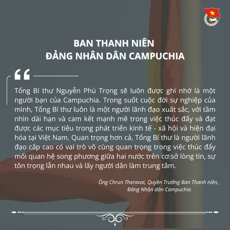 Được tin đồng chí Nguyễn Phú Trọng, Tổng Bí thư Ban Chấp hành Trung ương Đảng Cộng sản Việt Nam từ trần, lãnh đạo các tổ chức thanh niên trên thế giới đã gửi các điện, thư, thông điệp chia buồn với Đảng, Chính phủ, nhân dân và thanh thiếu nhi nước ta.