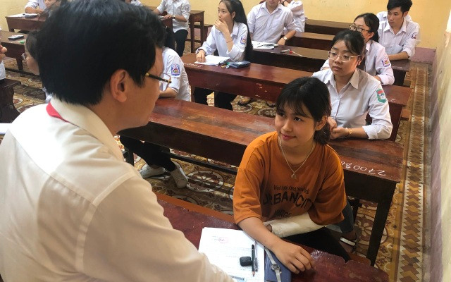 Cục trưởng Cục Quản lý chất lượng (Bộ GD-ĐT) Mai Văn Trinh động viên, thăm hỏi thi sinh bị tai nạn gãy tay và chân trái tại điểm thi THPT Nguyễn Huệ (Tam Điệp, Ninh Bình).