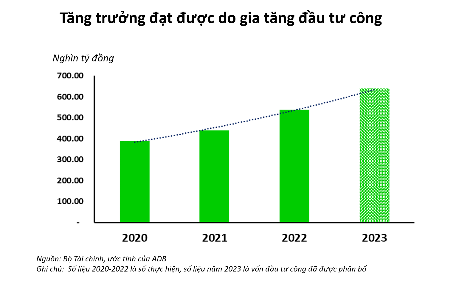 Theo chuyên gia ADB, đầu tư công sẽ là động lực chính cho phục hồi và tăng trưởng kinh tế Việt Nam trong năm 2023. Dự kiến một lượng đáng kể vốn đầu tư công sẽ được giải ngân, khi Chính phủ cam kết giải ngân 30 tỷ USD trong năm nay, trong đó 90% đã được phân bổ cho các bộ, ngành và các tỉnh, thành phố để giải ngân từ tháng 1/2023.