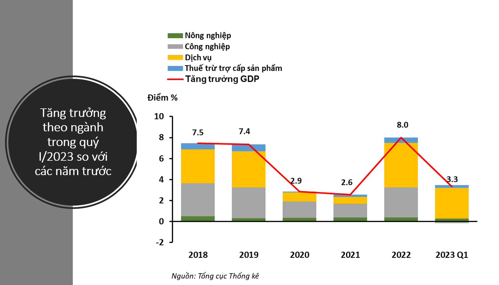 Đây là lĩnh vực duy nhất tăng trưởng dương trong quý I/2023 và vượt cùng kỳ năm ngoái, đặc biệt dịch vụ du lịch tăng mạnh sẽ là đầu tàu kéo theo các cực tăng trưởng khác.