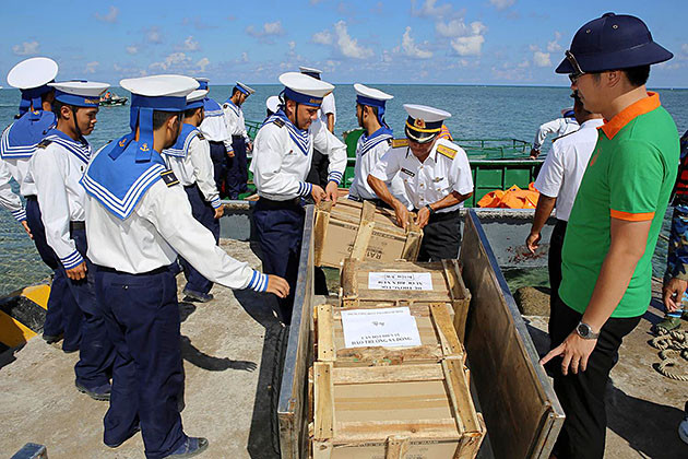 Trường Sa Đông là đảo đưa chiếc máy NT-30 đầu tiên vào vận hành. Máy có công suất thực tế 600 lít nước ngọt/ngày, vượt 20% công suất thiết kế, chất lượng nước đạt tiêu chuẩn 01:2009/BYT, do Bộ Y tế ban hành. Trong ảnh: các chiến sĩ tại Trường Sa Đông đang tiếp nhận thiết bị NT-30 đầu tiên được vận chuyển ra đảo.