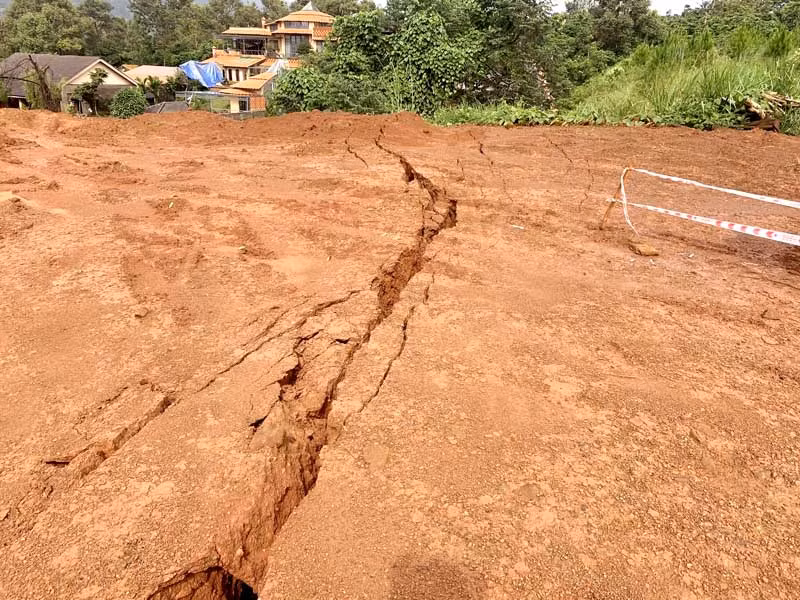 Dọc theo điểm sụt lún, xuất hiện vết nứt khoảng 100m qua vườn cà-phê người dân.