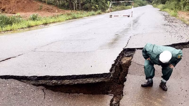 Sụt lún làm đứt gãy mặt đường tạo thành hố sâu hơn 1m hết nền đường.