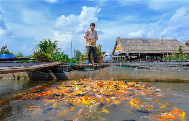 Ông Lý Văn Bon (Bảy Bon) nuôi cá chép Koi để làm du lịch ở Cồn Sơn, thành phố Cần Thơ. (Ảnh: TTXVN)