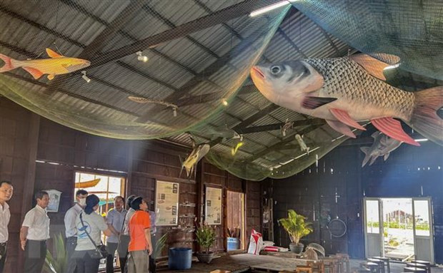 Mô hình 3D các loài cá quý hiếm của sông Hậu được giới thiệu ở Phòng Thông tin nghề cá trên bè của ông Lý Văn Bon ở Cồn Sơn. (Ảnh: TTXVN)