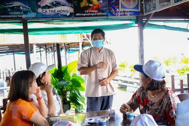 Ông Lý Văn Bon giới thiệu các loài cá của sông Hậu cho du khách đến tham quan Cồn Sơn. (Ảnh: TTXVN)