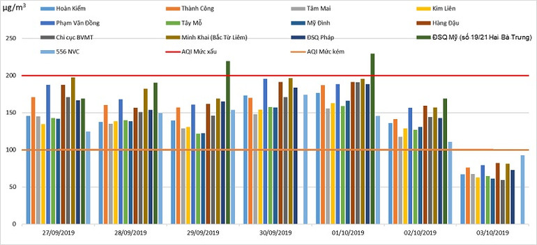 Số liệu tổng hợp từ 13 trạm quan trắc tự động, liên tục trên địa bàn thành phố Hà Nội trong khoảng thời gian từ 27-9 đến 2-10 cho thấy nồng độ PM2.5 đều vượt QCVN từ 1,2 đến 2,3 lần. Trong các ngày từ 28/9 đến 02/10, số liệu PM2.5 tại trạm của Sứ quán Mỹ có giá trị cao nhất.