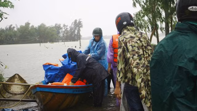Chính quyền xã Bình Châu (Quảng Ngãi) dùng thuyền đưa người dân sơ tán.