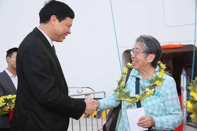 Lãnh đạo tỉnh Quảng Ninh tặng hoa cho du khách đầu tiên “ xông” Cảng.