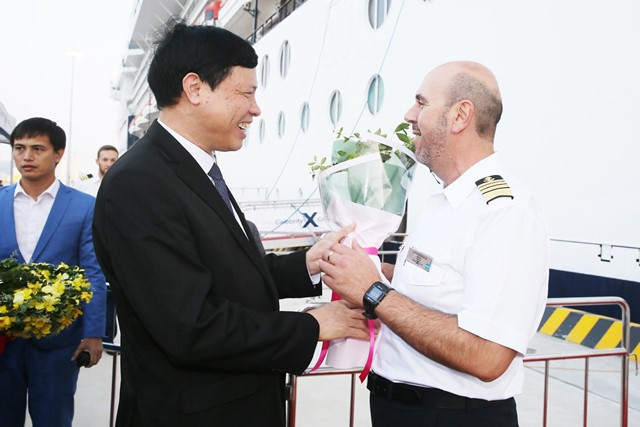 Lãnh đạo tỉnh Quảng Ninh tặng hoa cho thuyền trưởng tàu Celebrity Millennium.