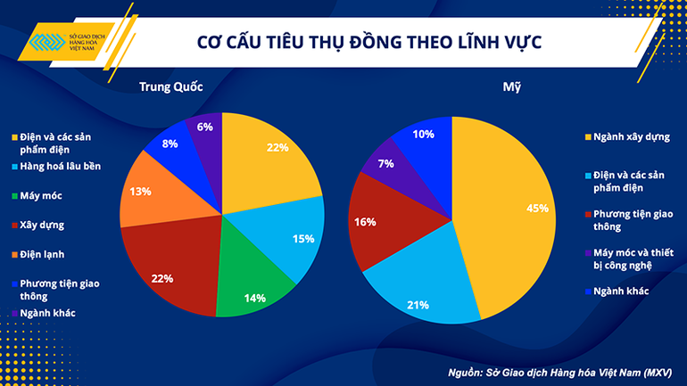 Theo MXV, xét về cơ cấu sử dụng theo lĩnh vực tại hai quốc gia này, đây đều là những ngành tiêu thụ một lượng đồng lớn làm nguyên liệu đầu vào. Do đó, với những đòn đánh thuế liên tiếp được tung ra, cả hai quốc gia đều đánh mất thị phần quan trọng trong bức tranh tiêu thụ hàng hóa và gián tiếp làm sụt giảm nhu cầu về đồng, gây áp lực đến giá trong suốt giai đoạn căng thẳng thương mại.