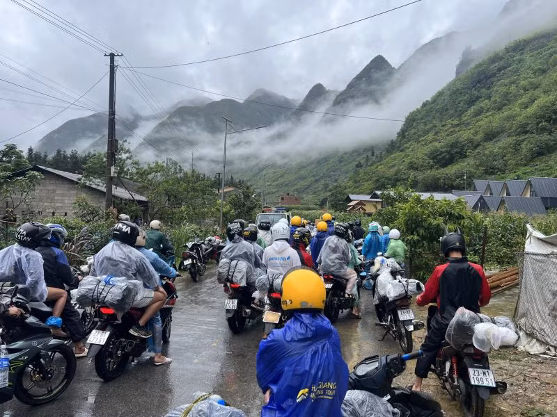Đến 8 giờ sáng cùng ngày, nhiều đoàn du khách nước ngoài, chủ yếu di chuyển bằng xe máy đi từ huyện Đồng Văn sang huyện Mèo Vạc bị mắc kẹt trước đoạn đường bị ngập sâu.