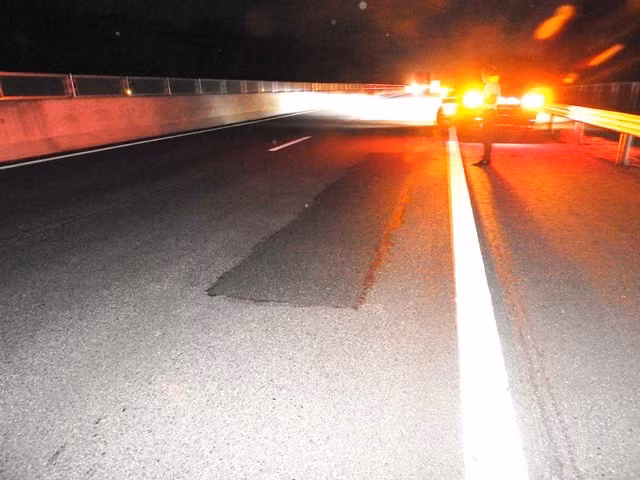 Chiều tối 5-10, khi lưu thông trên tuyến cao tốc này, chúng tôi nhận thấy có hàng chục vị trí điểm mặt đường bị hư hại, tạo thành ổ gà, ổ trâu. Một số mảng bong tróc lớn vừa được vá vội, với mảng nhựa đường còn mới tinh.