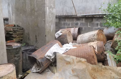 Chung quanh kho thuốc BVTV này còn nhiều thùng phuy gỉ sét vất bừa bãi.