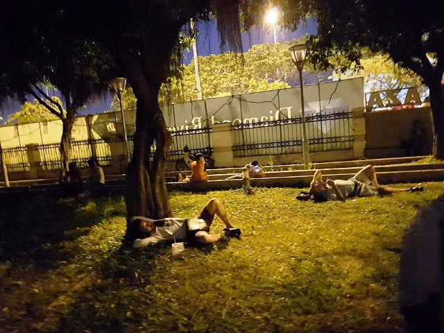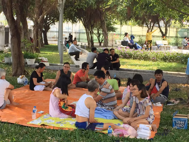 Người dân nằm la liệt, mệt mỏi, bất an ở các công viên gần nơi xảy ra vụ cháy.