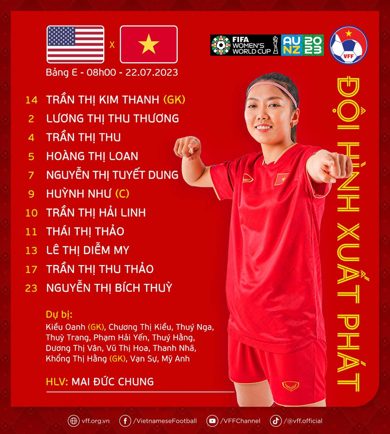 Sáng 22/7, đội tuyển nữ Việt Nam chạm trán đội tuyển nữ Mỹ ở trận ra quân bảng E World Cup nữ 2023. Trước giờ thi đấu, huấn luyện viên hai đội vừa công bố đội hình xuất phát.