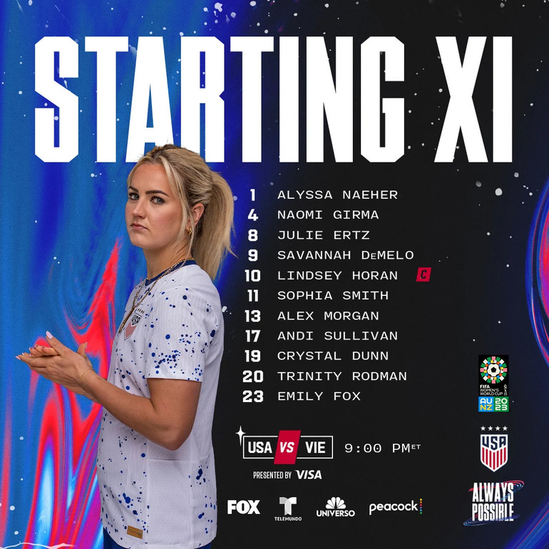 Đội hình ra sân của đội tuyển nữ Mỹ: Naeher, Girma, Ertz, Demelo, Horan, Smith, Morgan, Sullivan, Dunn, Rodman, Fox.