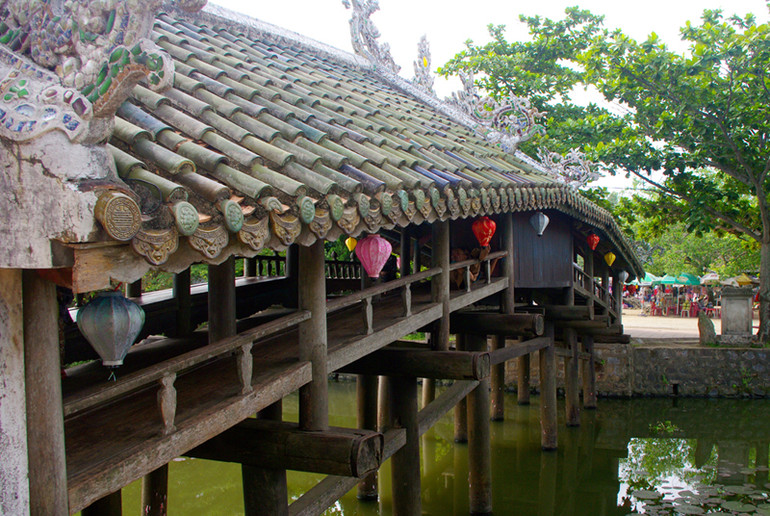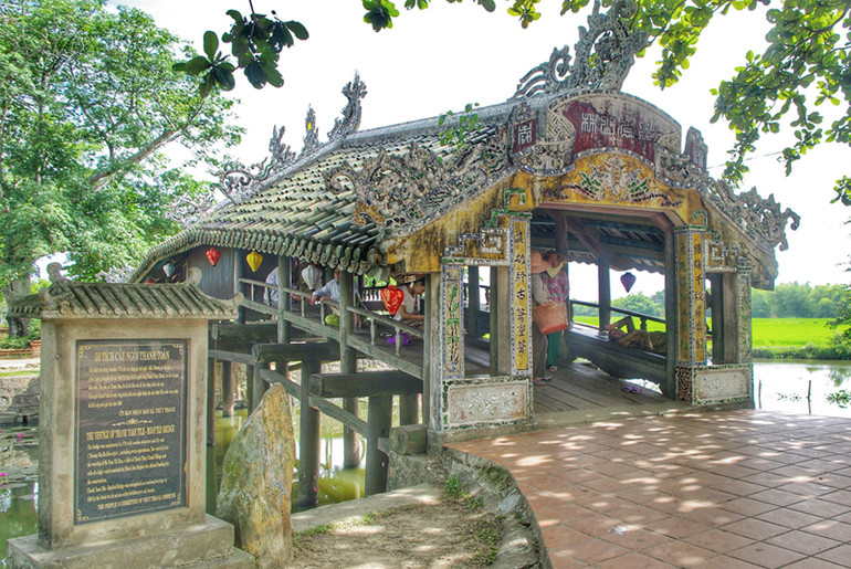 Từ bên ngoài nhìn vào có cảm giác cầu như một ngôi nhà do trên cầu có mái che, phủ ngói lưu ly. Được xây dựng cách đây hơn hai thế kỷ, ban đầu cây cầu có chiều dài 18,75m, rộng 5,82m. Trải qua dấu ấn tháng năm, lụt lội, chiến tranh... đã được xây dựng, trùng tu lại nhiều lần, kích thước đã bị thu hẹp chiều dài còn 16,85m và rộng là 4,63m.