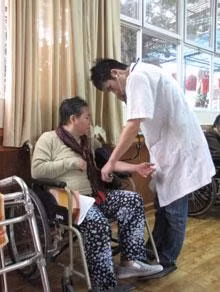 Cụ Phú bị liệt cả hai chân, phải ngồi xe lăn, ở trung tâm Nhân Ái đã gần hai năm. Cụ bảo: “Gần 90 tuổi rồi. Ở đây được chăm sóc tốt. Hằng ngày tập kéo dây và nói chuyện với các cụ, vui lắm”.