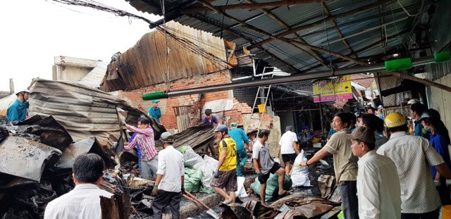 Giúp dân thu dọn đồ đạc sau vụ cháy chợ Chà Là.