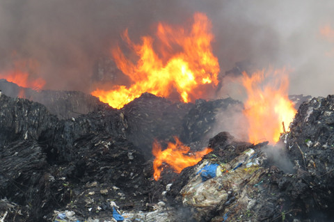 Sáng nay ngọn lửa vẫn còn cháy dữ dội ở bãi chứa nhựa phé thải.