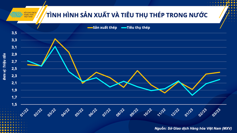 Báo cáo mới nhất từ Hiệp hội Thép Việt Nam, sản xuất thép thành phẩm trong tháng 3 đạt 2,4 triệu tấn, tăng 2,25% so với trước nhưng giảm 27,9% so với cùng kỳ năm ngoái. Bán hàng thép các loại đạt 2,2 triệu tấn, tăng 6,29% so với tháng 2 nhưng giảm 29% so với cùng kỳ.