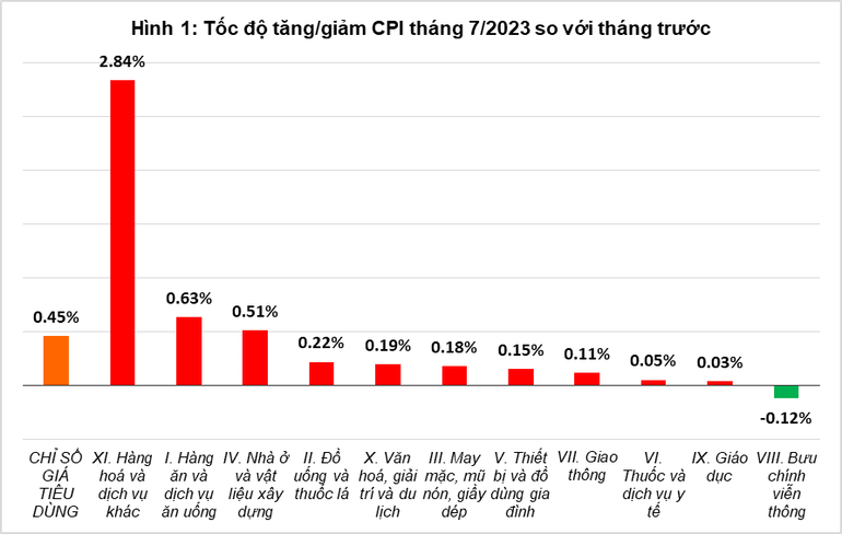 Theo Tổng cục Thống kê, so với tháng trước, CPI tháng 7/2023 tăng 0,45% (khu vực thành thị tăng 0,34%; khu vực nông thôn tăng 0,58%). Trong 11 nhóm hàng hóa và dịch vụ tiêu dùng chính, có 10 nhóm hàng tăng giá so với tháng trước; riêng nhóm bưu chính viễn thông giá giảm 0,12%.
