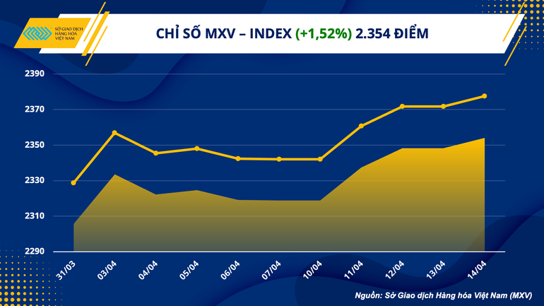 Thông tin từ Sở Giao dịch Hàng hóa Việt Nam (MXV) cho biết, đóng cửa tuần chỉ có 5 trên tổng số 31 mặt hàng suy yếu. Đà tăng mạnh của nhiều mặt hàng chủ chốt đã hỗ trợ chỉ số MXV-Index chốt tuần tăng hơn 1,5% lên 2.354 điểm, cao nhất trong vòng 6 tuần trở lại đây. Giá trị giao dịch toàn Sở tiếp tục ổn định, trung bình đạt mức 4.100 tỷ đồng mỗi phiên.