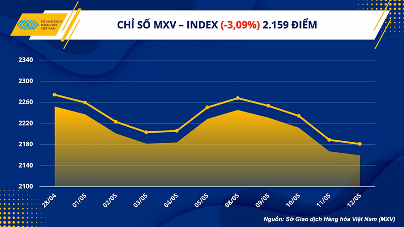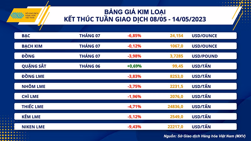 Nhóm kim loại đóng vai trò dẫn dắt đà giảm của thị trường, khi 9 trên 10 mặt hàng kim loại đang giao dịch tại MXV đóng cửa giảm giá. Đối với nhóm kim loại quý, giá bạc giảm mạnh 6,85% về 24,15 USD/ounce, mức giá thấp nhất kể từ ngày 04/04. Giá bạch kim giảm nhẹ về 1.067 USD/ounce.