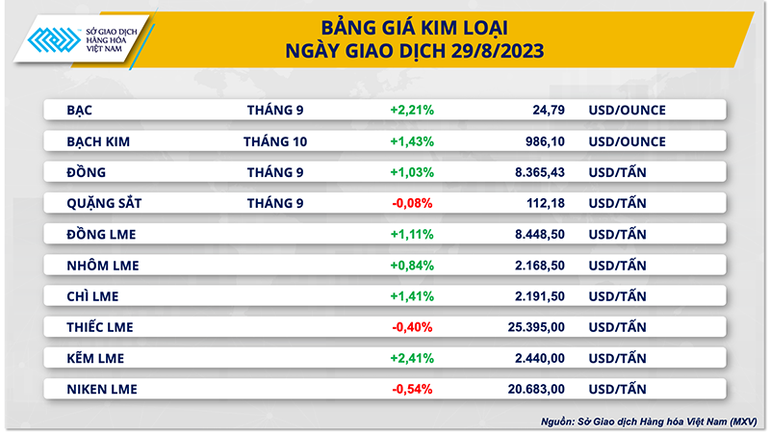 Kết thúc phiên giao dịch ngày 29/8, sắc xanh áp đảo bảng giá thị trường kim loại. Với nhóm kim loại quý, giá bạc tăng mạnh nhất với mức tăng 2,2% lên 24,78 USD/ounce, giá bạch kim tăng 1,43% chốt phiên tại mức 986 USD/ounce. Giá vàng tăng lên mức 1.937 USD/ounce sau khi tăng 0,91%.