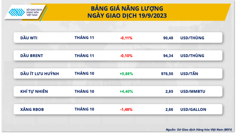 Trên thị trường năng lượng, giá khí tự nhiên nối dài đà tăng mạnh từ ngày trước đó. Đóng cửa, mặt hàng này tăng vọt 4,4% lên 2,85 USD/MMBtu. Theo MXV, số liệu từ báo cáo Cơ quan Thông tin Năng lượng Mỹ (EIA) tiếp tục hỗ trợ giá khí tự nhiên. Cụ thể, EIA cho biết, tổng sản lượng khí tại các lưu vực đá phiến lớn sẽ giảm 0,3 tỷ feet khối mỗi ngày (bcfd) so với tháng 9, xuống mức 98,4 bcfd trong tháng 10. Điều này khiến sản lượng khí đốt theo xu hướng giảm tháng thứ 3 liên tiếp, làm dấy lên lo ngại thâm hụt nguồn cung.