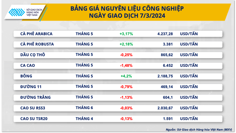 Giá trị giao dịch toàn Sở đạt trên 5.500 tỷ đồng. Đáng chú ý, giá hai mặt hàng nhóm nguyên liệu công nghiệp là cà-phê và bông tăng vọt, trong đó giá cà-phê Robusta thiết lập kỷ lục mới trong vòng 30 năm. Bên cạnh đó, 10/10 mặt hàng kim loại cũng nổi bật trong sắc xanh.