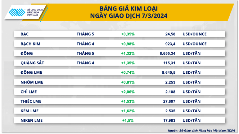 Khép lại ngày giao dịch 7/3, tất cả các mặt hàng kim loại đồng loạt tăng giá. Đối với kim loại quý, đồng USD tiếp tục suy yếu đã hỗ trợ giá bạc và giá bạch kim tăng hai phiên liên tiếp. Chốt phiên, giá bạc đóng cửa tại mức 24,57 USD/ounce nhờ tăng 0,35%. Giá bạch kim bật tăng 0,98% lên 923,4 USD/ounce, mức cao nhất trong vòng hơn một tháng trở lại đây.