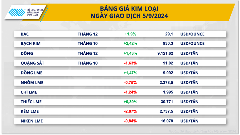 Kết thúc ngày giao dịch 5/9, sắc xanh dần quay lại bảng giá kim loại. Đối với kim loại quý, giá bạc tăng hai phiên liên tiếp với mức tăng 1,9% lên 29,09 USD/ounce. Giá bạch kim cũng phục hồi sau ba phiên giảm liên tiếp, đóng cửa tại mức 930,3 USD/ounce nhờ tăng 2,42%. Nhóm kim loại quý tiếp tục được hưởng lợi sau khi Mỹ công bố dữ liệu việc làm yếu kém, củng cố cho kịch bản hạ lãi suất của Cục Dự trữ Liên bang Mỹ (FED).