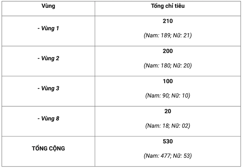 Theo đó, tổng chỉ tiêu tuyển sinh là 530 chỉ tiêu tuyển sinh đào tạo nhóm ngành nghiệp vụ cảnh sát, gồm Nam: 477; Nữ: 53 chỉ tiêu. Cụ thể: