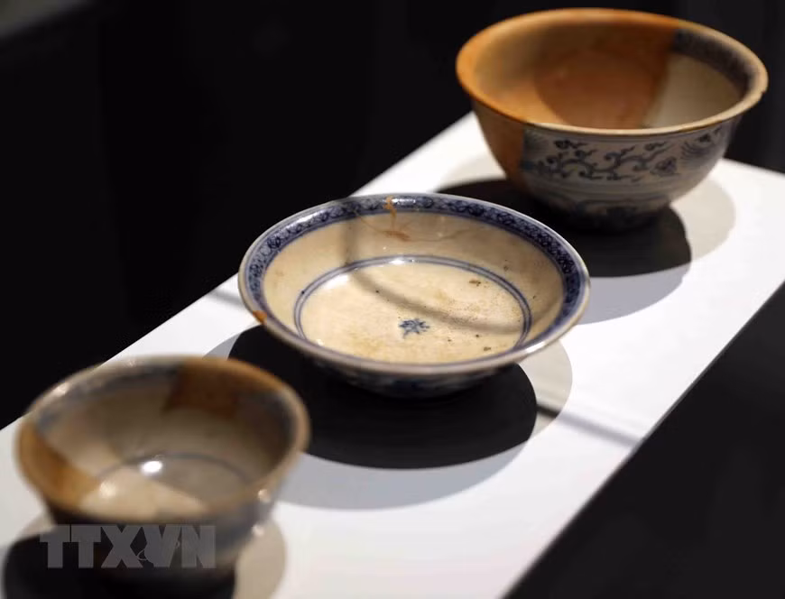 Hình ảnh bộ sưu tập bát, đĩa gốm hoa lam ngự dụng thời Lê sơ, niên đại thế kỷ 15-đầu thế kỷ 16; hiện lưu giữ tại Trung tâm Bảo tồn di sản Thăng Long-Hà Nội.